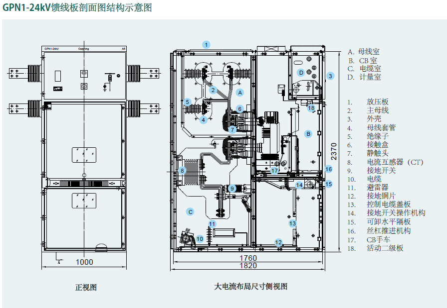 电流互感器和接地开关可安装在电缆室后墙上。电位互感器和避雷器可安装在其内部。仪表室包括继电器部件、仪表通电指示器和规定的二次设备。控制电路布置在有足够空间和金属盖板的颈槽内。
