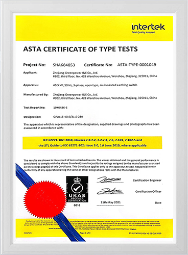 ASTA证书-40.5kV接地开关